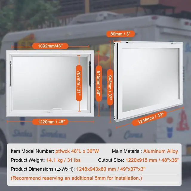 VEVOR Concession Window 48"x36", Aluminum Alloy Food Truck Service Window with Awning Door & Drag Hook, Up to 85 Degrees Stand Serving Window for Food Trucks Concession Trailers, Glass Not Included
