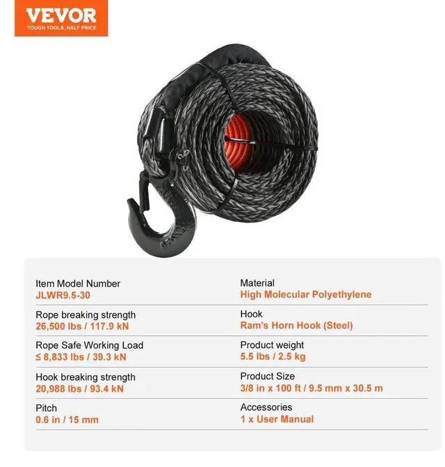 Rope Safe Working Load: 8,833 lbs / 39.3 kN,Hook: Ram's Horn Hook (Steel),Rope Breaking Strength: 26,500 lbs / 117.9 kN,Hook Breaking Strength: 20,988 lbs / 93.4 kN,Item Model Number: JLWR9.5-30,Pitch: 0.6 in / 15 mm,Product Weight: 5.5 lbs / 2.5 kg,Material: High Molecular Polyethylene,Product Size: 3/8 in x 100 ft / 9.5 mm x 30.5 m