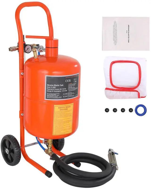 Operating Pressure: 60 - 110 PSI,Tank Capacity: 5 Gallon / 18.92 L,Wheel Size: Ø5.9" x 1.2" / Ø150 x 31.5 mm,Applicable Abrasive: 60-100 Grit,Item Model Number: FF-Q901,Product Weight: 24.7 lbs / 11.21 kg,Oil-Water Separator: Yes,Suggested Abrasive Capacity: 2.8 Gallon / 10.5 L,Product Dimensions: 13.4" x 13.6" x 30.3" / 340 x 345 x 770 mm