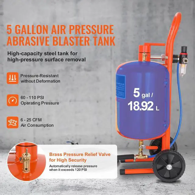 VEVOR 5 Gallon Sand Blaster, 60-110 PSI High Pressure Sandblaster, Portable Abrasive Blasting Tank, Air Sand Blasting Kit with 4 Ceramic Nozzles and Oil-Water Separator for Paint, Stain, Rust Removal