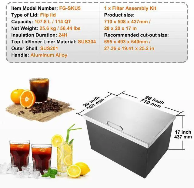 Top Lid/Inner Liner Material: SUS304,Capacity: 107.8L / 114 QT,Item Model Number: FG-SKU5,Outer Shell: SUS201,Insulation Duration: 24H,Net Weight: 25.6 kg / 56.44 lbs,Handle: Aluminum Alloy