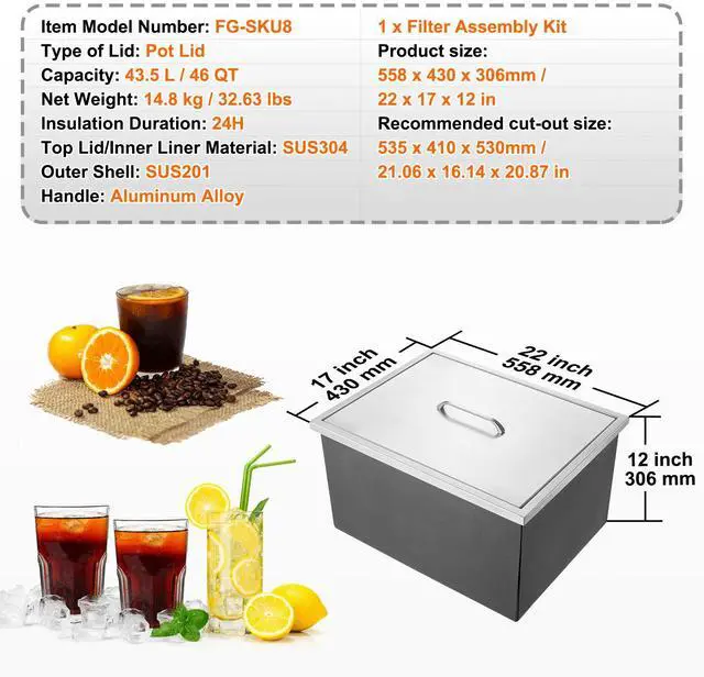 Top Lid/Inner Liner Material: SUS304,Capacity: 43.5L / 46QT,Item Model Number: FG-SKU8,Outer Shell: SUS201,Insulation Duration: 24H,Net Weight: 14.8 kg / 32.63 lbs,Handle: Aluminum Alloy