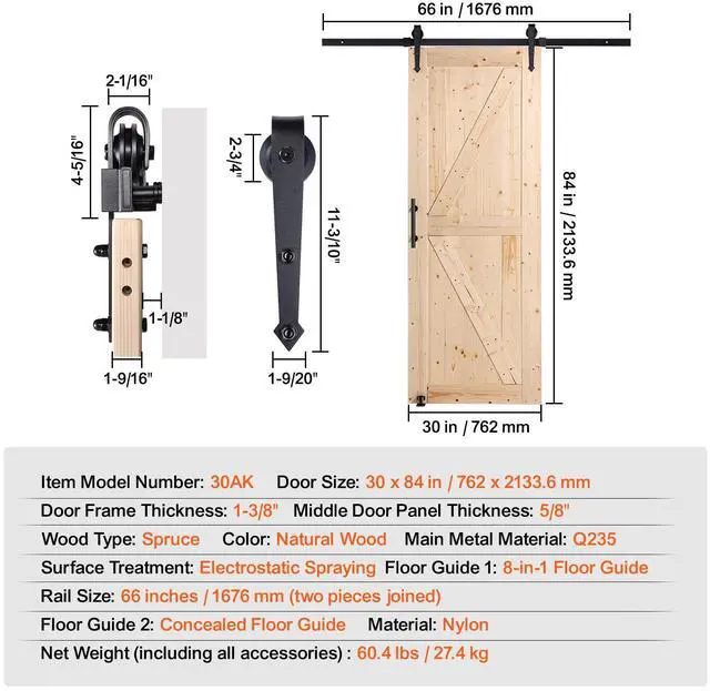 Net Weight (including all accessories) : 60.4 lbs / 27.4 kg,Door Size: 30 x 84 inches / 762 x 2133.6 mm,Main Metal Material: Q235,Middle Door Panel Thickness: 5/8",Item Model Number: 30AK,Door Frame Thickness: 1-3/8",Wood Type: Spruce,Rail Size: 66 inches / 1676 mm (two pieces joined)