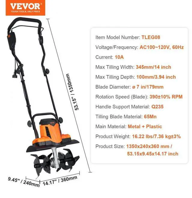 Blade Diameter: ø 7 in/179mm,Voltage/Frequency: AC100~120V, 60Hz,Tilling Blade Material: 65Mn,Item Model Number: TLEG08,Product Weight: 16.22 lbs/7.36 kg±3%,Rotation Speed (Blade): 390±10% RPM,Handle Support Material: Q235,Product Size(LxWxH): 1350x240x360 mm/53.15x9.45x14.17 inch,Max Tilling Width: 345mm/14 inch,Max Tilling Depth: 100mm/3.94 inch,Current: 10A,Main Material: Metal + Plastic