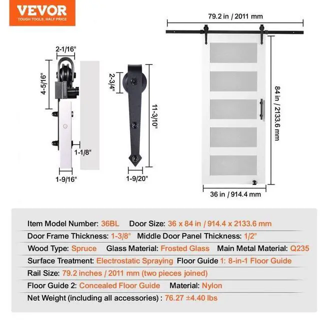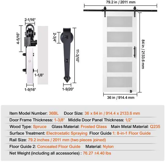 Glass Material: Frosted Glass,Net Weight (including all accessories) : 76.27 lbs / 34.6kg,Door Size: 36 x 84 inches / 914.4 x 2133.6 mm,Main Metal Material: Q235,Middle Door Panel Thickness: 1/2",Item Model Number: 36BL,Door Frame Thickness: 1-3/8",Wood Type: Spruce,Rail Size: 79.2 inches / 2011 mm (two pieces joined)