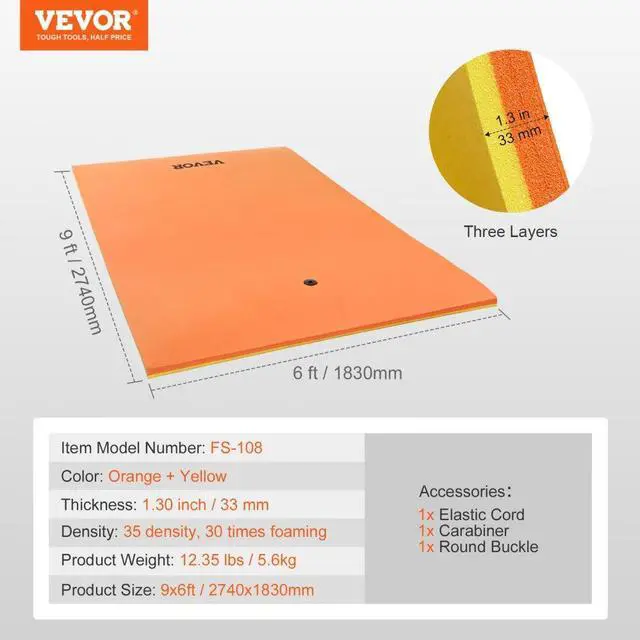 Thickness: 1.30 inch / 33 mm,Color: Orange + Yellow,Item Model Number: FS-108,Product Weight: 12.35 lbs / 5.6 kg,Density: 35 density, 30 times foaming,Product Size: 9x6 ft / 2740x1830 mm