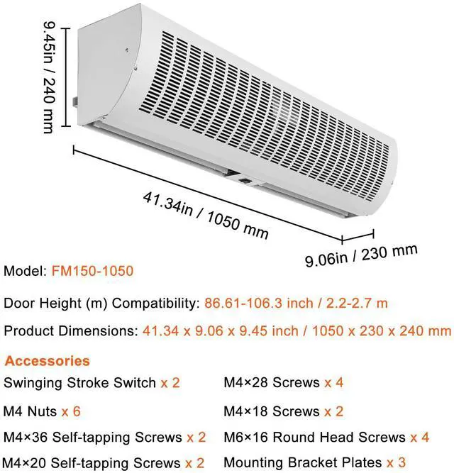 Fit for Door Height: 85.83 - 104.33 inch / 2.2-2.7 m,Max Airflow(CFM/m³/h): 1350/2292,Voltage: AC120V 60Hz,Model: FM150-1050-U,Product Dimensions: 41.34 x 9.06 x 9.45 inch / 1050 x 230 x 240 mm,Colour: White