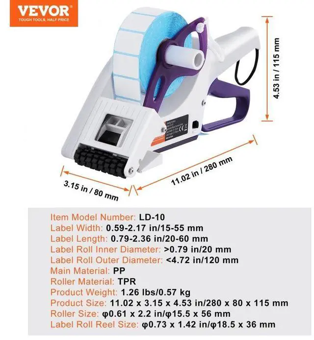 Label Roll Reel Size: 0.73 x 1.42 in/18.5 x 36 mm,Label Width: 0.59-2.17 in/15-55 mm,Item Model Number: LD-10,Roller Material: TPR,Product Weight: 1.26 lbs/0.57 kg,Roller Size: 0.61 x 2.2 in/15.5 x 56 mm,Label Length: 0.79-2.36 in/20-60 mm,Label Roll Inner Diameter: >0.79 in/20 mm,Label Roll Outer Diameter: less than 4.72 in/120 mm,Main Material: PP,Product Size: 11.02 x 3.15 x 4.53 in/280 x 80 x 115 mm