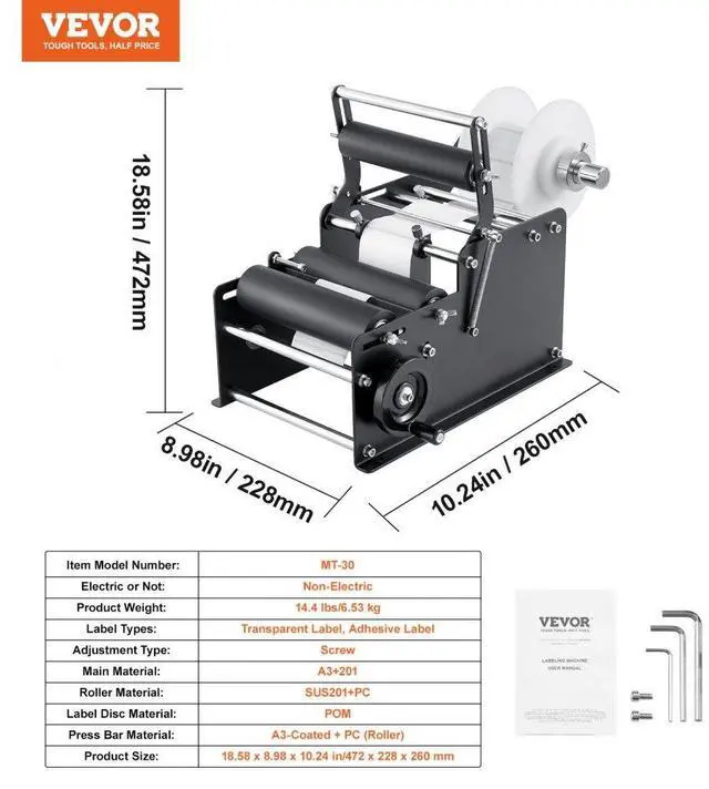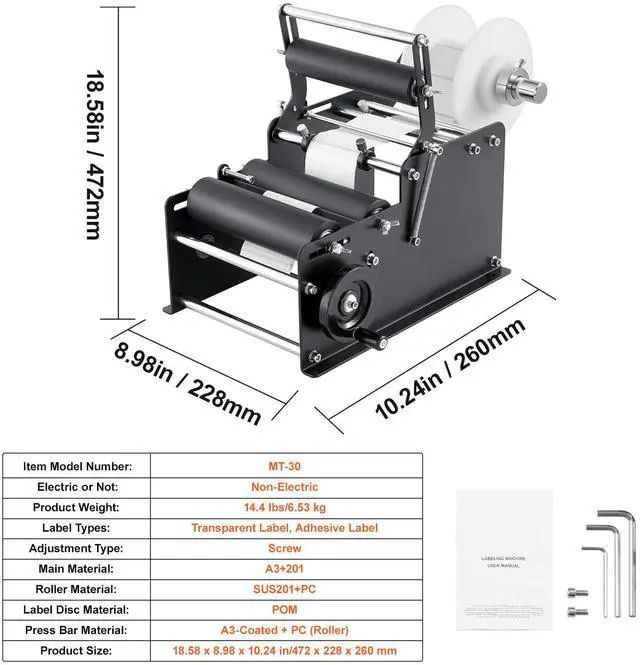 Label Width: 0.39-5.12 in/10-130 mm,Label Disc Material: POM,Electric or Not: Non-Electric,Roller Material: SUS201+PC,Label Length: 0.39-11.81 in/10-300 mm,Press Bar Material: A3-Coated + PC (Roller),Label Roll Outer Diameter: <7.09 in/<180 mm,Product Size: 18.58 x 8.98 x 10.24 in/472 x 228 x 260 mm,Item Model Number: MT-30,Product Weight: 14.4 lbs/6.53 kg,Label Types: Transparent Label, Adhesive Label,Label Roll Inner Diameter: 0.98 in/25 mm,Main Material: A3+201,Adjustment Type: Screw