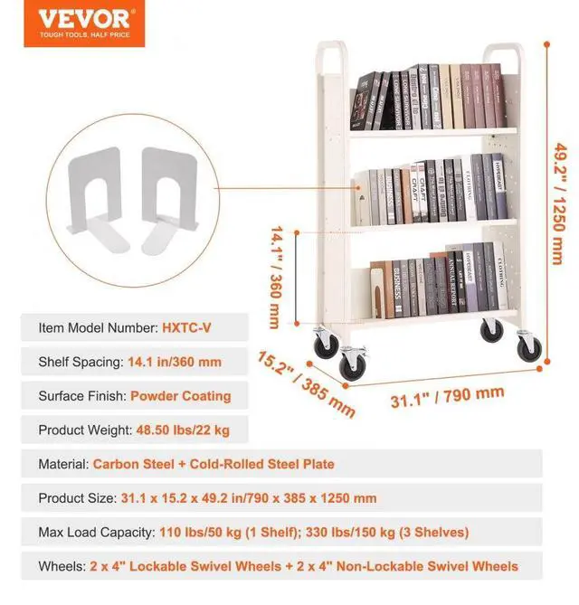 VEVOR Book Cart, 330 lbs Library Cart, 31.1" x 15.2" x 49.2" Rolling Book Cart, Single Sided V-Shaped Sloped Shelves with 4-Inch Lockable Wheels for Home Shelves Office and School, Book Truck in White