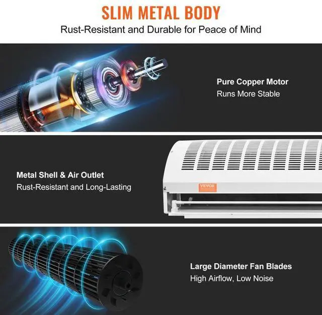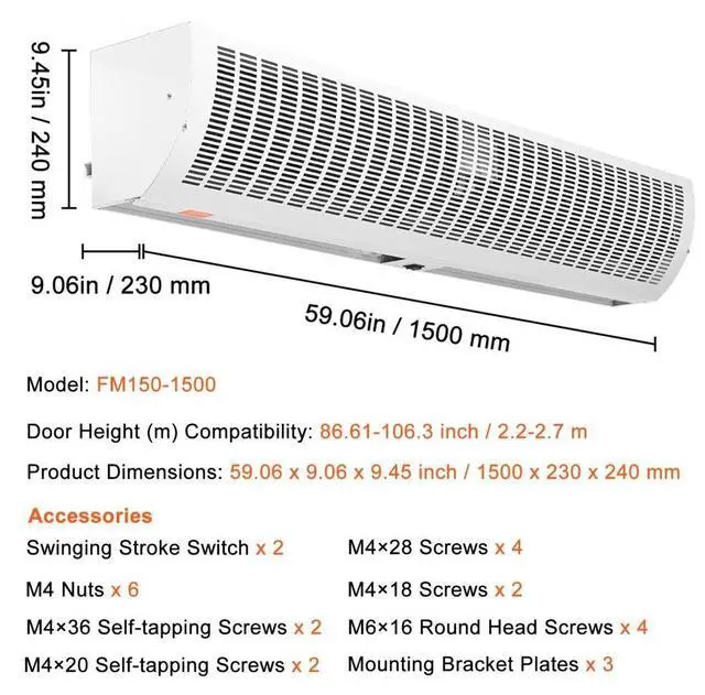 Fit for Door Height: 85.83 - 104.33 inch / 2.2-2.7 m,Max Airflow(CFM/m³/h): 2100/3566,Voltage: AC120V 60Hz,Model: FM150-1500-U,Product Dimensions: 59.06 x 9.06 x 9.45 inch / 1500 x 230 x 240 mm,Colour: White