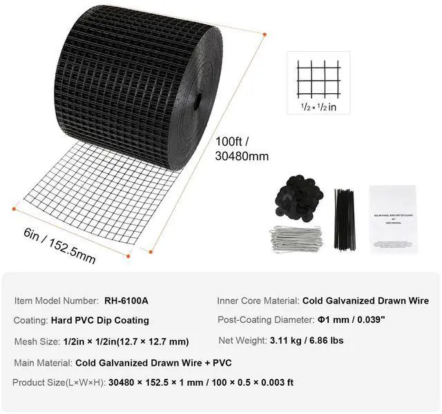 VEVOR 6 inch x 100ft Solar Panel Bird Guard, Critter Guard Roll Kit with 60pcs Stainless Steel Fasteners, Solar Panel Guard with Rust-proof PVC Coating, 1/2 inch Wire Roll Mesh