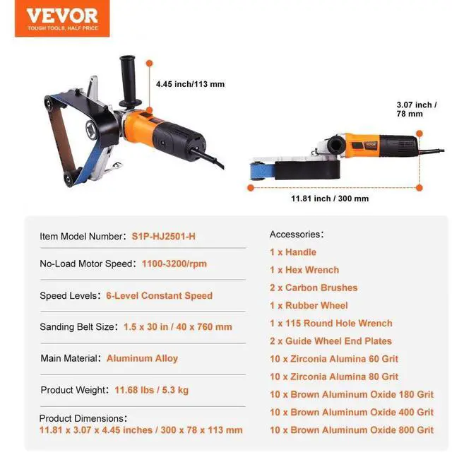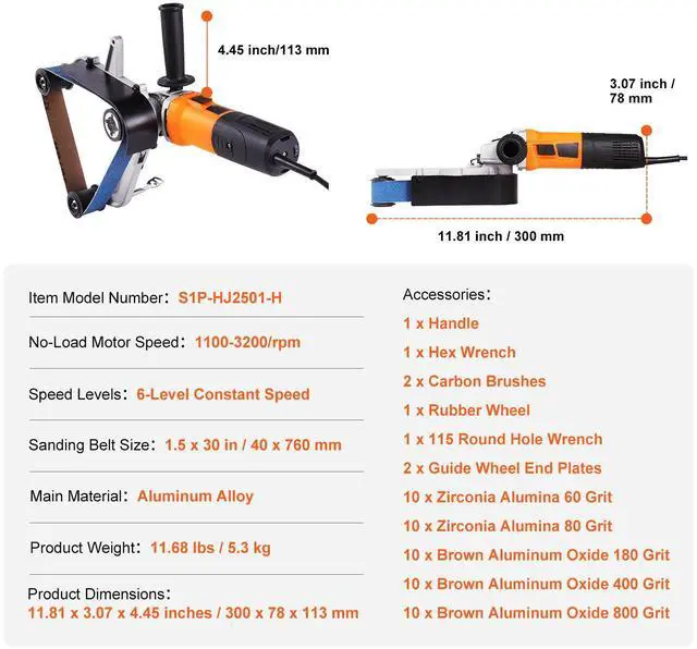 Item Model Number: S1P-HJ2501-H,Product Weight: 11.68 lbs / 5.3 kg,Speed Levels: 6-Level Constant Speed,Sanding Belt Size: 1.5 x 30 in / 40 x 760 mm,No-Load Motor Speed: 1100-3200/rpm,Product Dimensions: 11.81 x 3.07 x 4.45 inches / 300 x 78 x 113 mm,Main Material: Aluminum Alloy