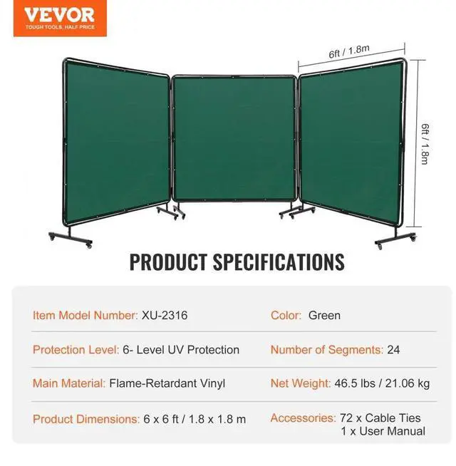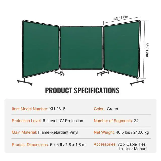 Protection Level: 6- Level UV Protection,Single Screen Dimensions: 6 x 6 ft / 1.8 x 1.8 m,Number of Segments: 24,Color: Green,Item Model Number: XU-2316,Net Weight: 46.4 lbs / 21.06 kg,Main Material: Flame-Retardant Vinyl