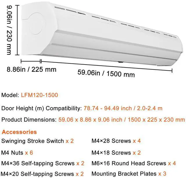 Fit for Door Height: 78.74 - 94.49 inch / 2.0-2.4 m,Max Airflow(CFM/m³/h): 1500/2547,Voltage: AC120V 60Hz,Model: LFM120-1500-U,Product Dimensions: 59.06 x 8.86 x 9.06 inch / 1500 x 225 x 230 mm,Colour: White