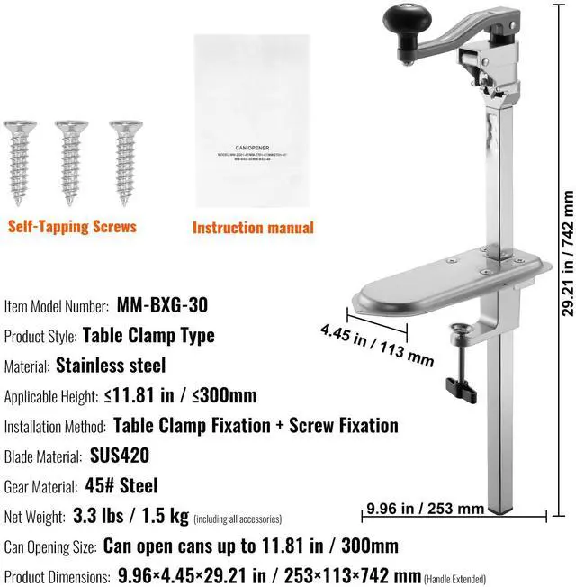Blade Material: SUS420,Installation Method: Table Clamp Fixation + Screw Fixation,Item Model Number: MM-BXG-30,Product Style: Table Clamp Type,Can Opening Size: Up to 11.81 inches / 300mm,Gear Material: 45# Steel,Product Dimensions: 29.21x9.96x4.44 inches / 742x253x113 mm,Net Weight: 3.3 lbs / 1.5 kg (including all accessories)