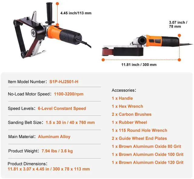 Item Model Number: S1P-HJ2501-H,Product Weight: 7.94 lbs / 3.6 kg,Speed Levels: 6-Level Constant Speed,Sanding Belt Size: 1.5 x 30 in / 40 x 760 mm,No-Load Motor Speed: 1100-3200/rpm,Product Dimensions: 11.81 x 3.07 x 4.45 in / 300 x 78 x 113 mm,Main Material: Aluminum Alloy