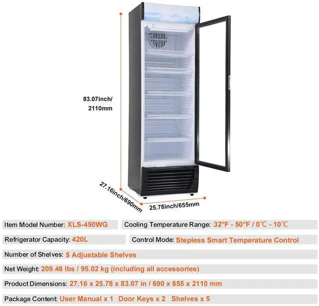 Number of Shelves: 5 Adjustable Shelves,Control Mode: Stepless Smart Temperature Control,Item Model Number: XLS-450WG,Refrigerator Capacity: 420L,Cooling Temperature Range: 32°F - 50°F / 0 - 10,Product Dimensions: 27.16 x 25.78 x 83.07 in / 690 x 655 x 2110 mm,Net Weight: 209.48 lbs / 95.02 kg (including all accessories)
