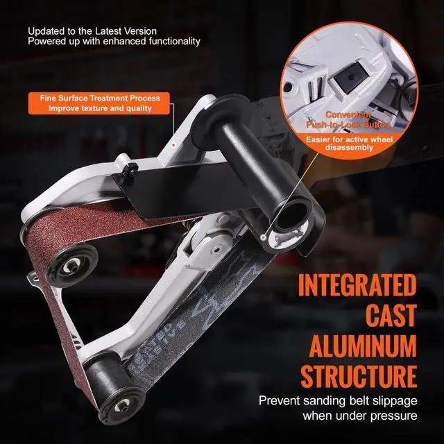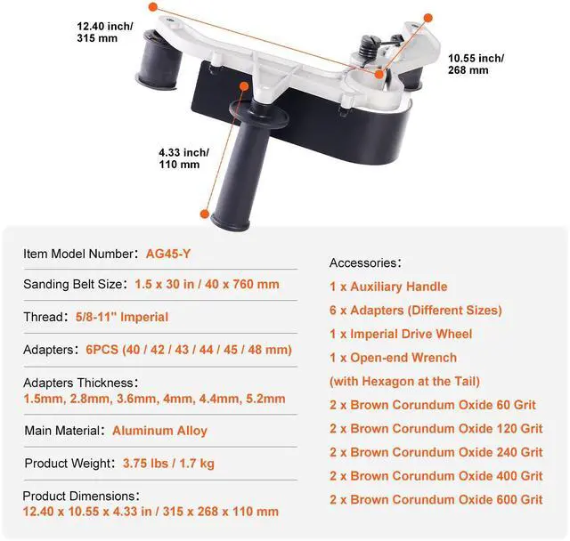 Adapters: 6PCS (40 / 42 / 43 / 44 / 45 / 48 mm),Item Model Number: AG45-Y,Product Weight: 3.75 lbs / 1.7 kg,Sanding Belt Size: 1.5 x 30 in / 40 x 760 mm,Adapters Thickness: 1.5mm, 2.8mm, 3.6mm, 4mm, 4.4mm, 5.2mm,Product Dimensions: 12.40 x 10.55 x 4.33 in / 315 x 268 x 110 mm,Main Material: Aluminum Alloy,Thread: 5/8-11" Imperial