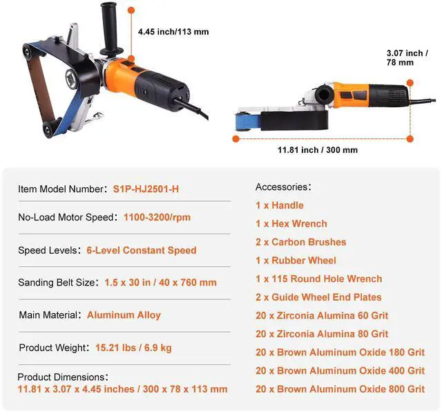 Item Model Number: S1P-HJ2501-H,Product Weight: 15.21 lbs / 6.9 kg,Speed Levels: 6-Level Constant Speed,Sanding Belt Size: 1.5 x 30 in / 40 x 760 mm,No-Load Motor Speed: 1100-3200/rpm,Product Dimensions: 11.81 x 3.07 x 4.45 inches / 300 x 78 x 113 mm,Main Material: Aluminum Alloy