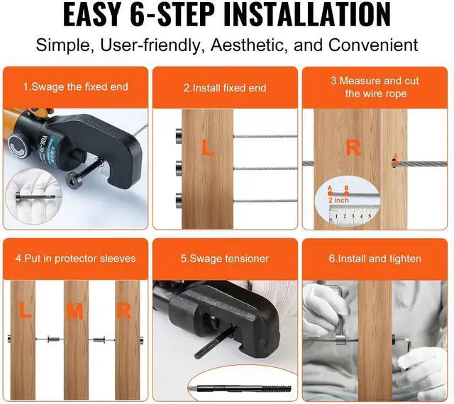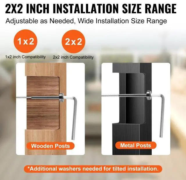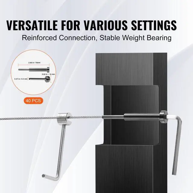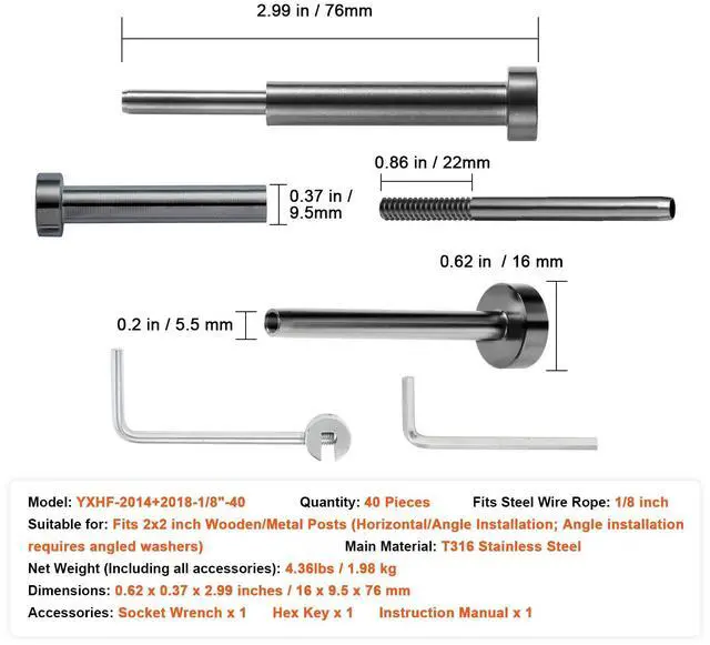 Fits: 2x2 inch Wooden/Metal Posts (Horizontal/Angle Installation; Angle installation requires angled washers).,Model: YXHF-2014+2018-1/8"-40,Fits Steel Wire Rope: 1/8 inch,Quantity: 40 Pieces,Dimensions: 0.62 x 0.37 x 2.99 inches / 16 x 9.5 x 76 mm,Main Material: T316 Stainless Steel,Net Weight (Including all accessories): 4.36lbs / 1.98kg