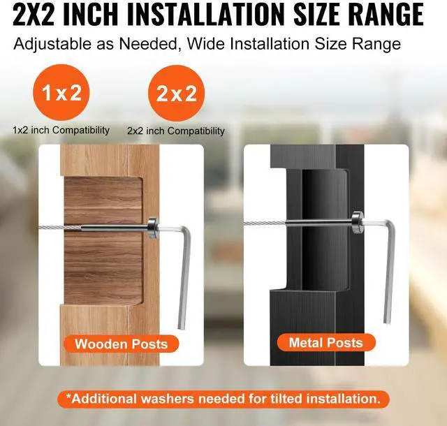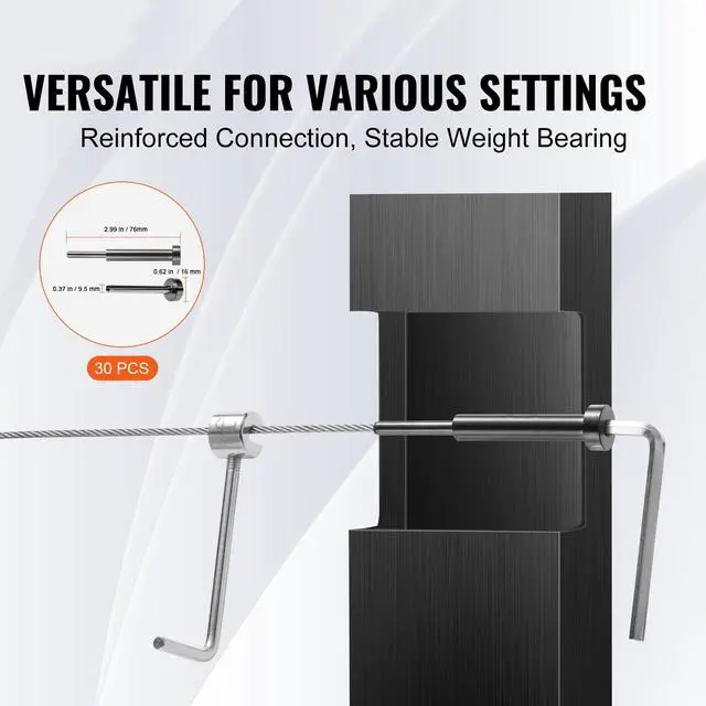 Fits: 2x2 inch Wooden/Metal Posts (Horizontal/Angle Installation; Angle installation requires angled washers).,Model: YXHF-2014+2018-1/8"-30,Fits Steel Wire Rope: 1/8 inch,Quantity: 30 Pieces,Dimensions: 0.62 x 0.37 x 2.99 inches / 16 x 9.5 x 76 mm,Main Material: T316 Stainless Steel,Net Weight (Including all accessories): 3.3lbs / 1.5kg