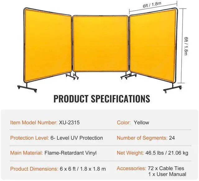Protection Level: 6- Level UV Protection,Single Screen Dimensions: 6 x 6 ft / 1.8 x 1.8 m,Number of Segments: 24,Color: Yellow,Item Model Number: XU-2315,Net Weight: 46.4 lbs / 21.06 kg,Main Material: Flame-Retardant Vinyl