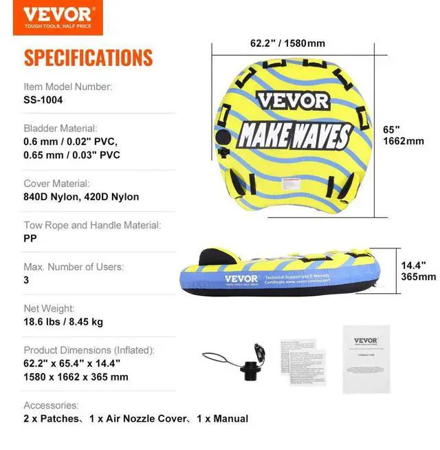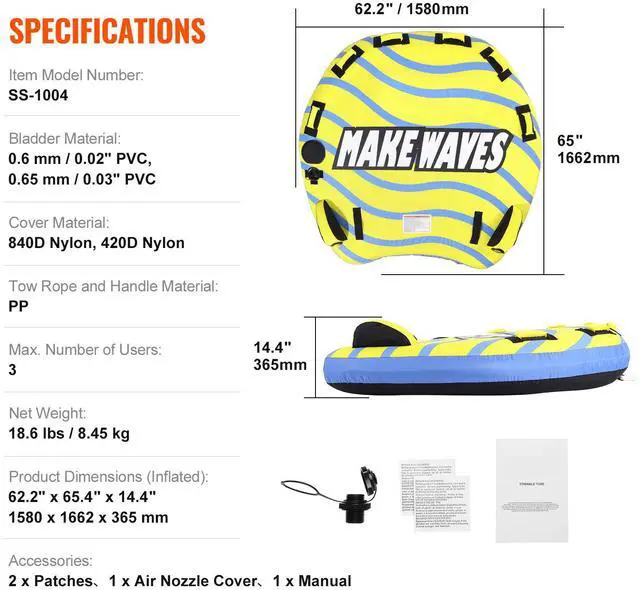 Bladder Material: 0.6 mm/0.02" PVC, 0.65 mm / 0.03" PVC,Tow Rope and Handle Material: PP,Load Capacity: 510 lbs/231 kg,Product Dimensions (Inflated): 62.2" x 65.4" x 14.4"/1580 x 1662 x 365 mm,Item Model Number: SS-1004,Cover Material: 840D Nylon, 420D Nylon,Max. Number of Users: 3,Net Weight: 18.6 lbs / 8.45 kg