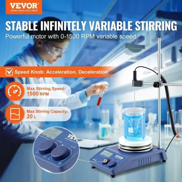 VEVOR Magnetic Stirrer Hot Plate, Max 644°F/340°C, 0-1500 RPM Hot Plate with Magnetic Stirrer, 20L Hot Plate Stirrer with LED Screen, Support Stand and Stir Bars Included, 650W Heating Power