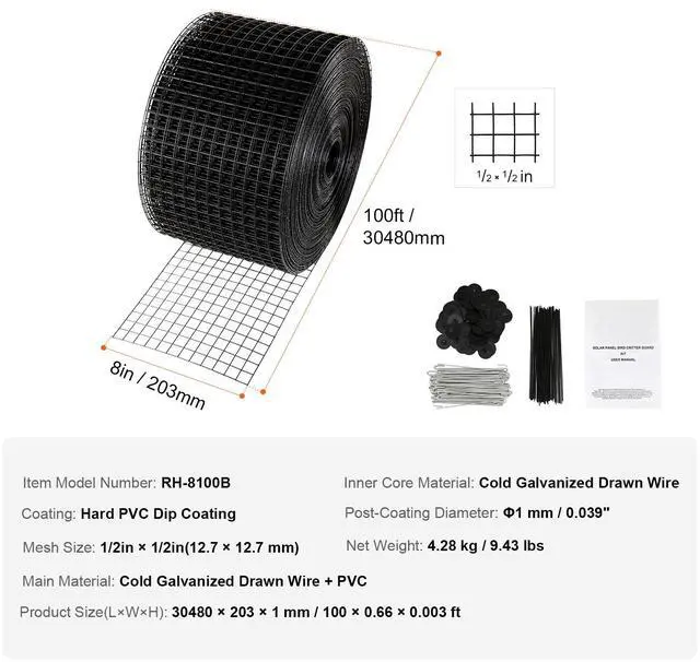 VEVOR 8 inch x 100ft Solar Panel Bird Guard, Critter Guard Roll Kit with 100pcs Stainless Steel Fasteners, Solar Panel Guard with Rust-proof PVC Coating, 1/2 inch Wire Roll Mesh
