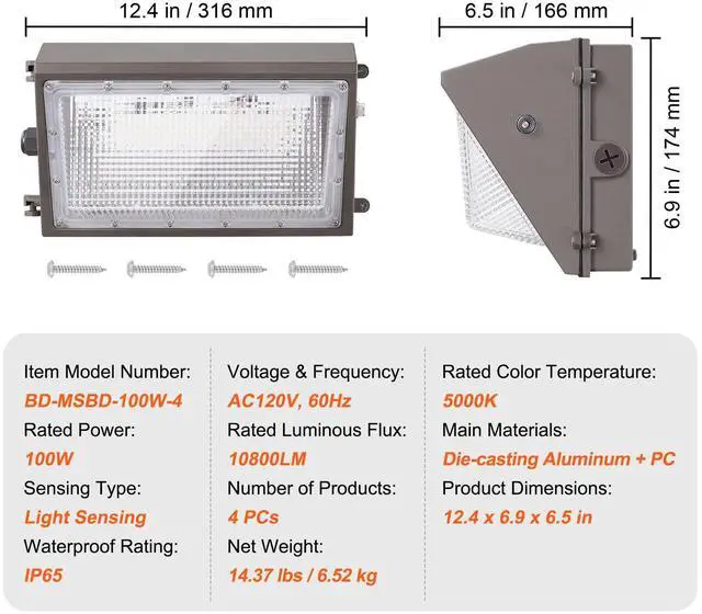 Rated Luminous Flux: 10800LM±10%,Waterproof Rating: IP65,Main Materials: Die-casting Aluminum + PC,Induction Type: Light Sensing,Item Model Number: BD-MSBD-100W-4,Number of Products: 4 PCs,Sensing Type: Light Sensing,Rated Power: 100W±10%,Voltage & Frequency: AC120V, 60Hz,Product Dimensions: 12.4 x 6.9 x 6.5''/316 x 174 x 166 mm,Net Weight: 14.37 lbs/6.52 kg ± 3%,Rated Color Temperature: 5000K±10%.