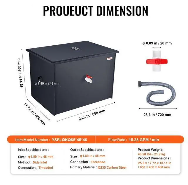 Primary Material: Q235 Carbon Steel,Flow Rate: 15.23 GPM/Min,Inlet Size: 1.89 inches / 48 mm,Outlet Size: 1.89 inches / 48 mm,Item Model Number: YSFLQKQ65*45*46,Product Weight: 48.28 lbs / 21.9 kg,Product Dimensions: 25.60x17.72x18.11 inch / 650x450x460 mm