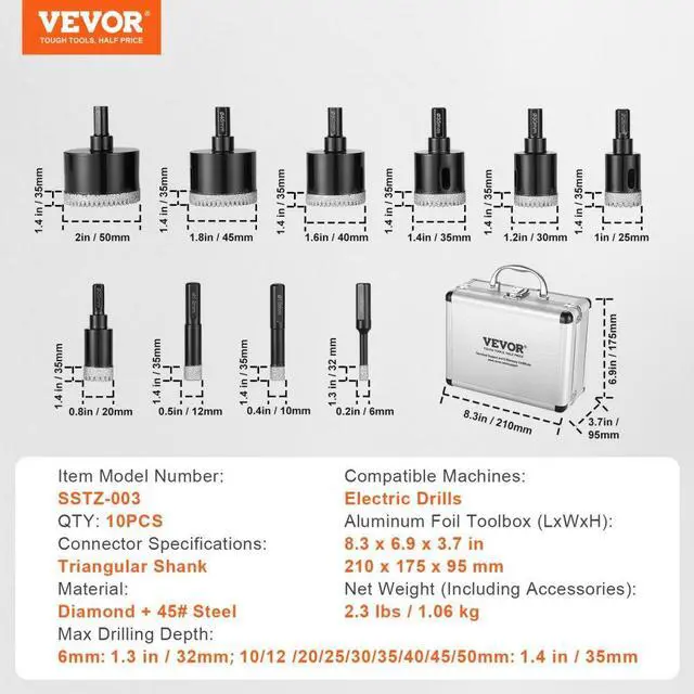 Compatible Machine: Electric Drills,Aluminum Foil Toolbox (LxWxH): 8.3 x 6.9 x 3.7 in / 210 x 175 x 95 mm,Net Weight (Including Accessories): 2.3 lbs / 1.06 kg,Item Model Number: SSTZ-003,Quantity: 10 Pieces,Max Drilling Depth: 1.3 in / 1.4 in,Material: Diamond + 45# Steel,Connector Specifications: Triangular Shank