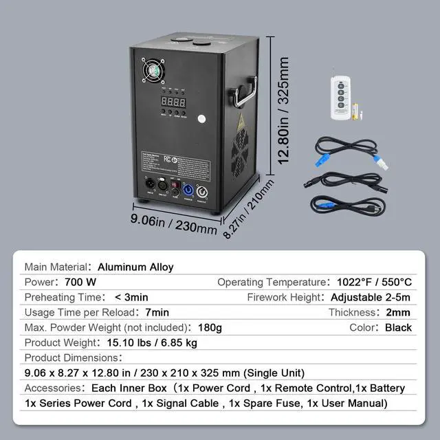 Operating Temperature: 1022°F/550°C,Preheating Time: <3min,Color: Black,Firework Height: Adjustable 6.6-16.4ft / 2-5m,Housing: Material: Aluminum Alloy (6063-T5); Thickness: 2mm,Product Dimensions: 9.06x8.27x12.80 inches / 230x210x325mm (Single Unit),Voltage Frequency: AC120V 60Hz,Model: BJY-PHJ700u1,Product Weight: 15.10 lbs / 6.85 kg,Usage Time per Reload: 7min,Maximum Injection Amount: 180g,Power: 700W,Main Material: Aluminum Alloy (6063-T5)