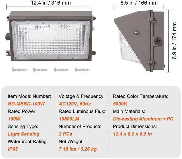 Rated Luminous Flux: 10800LM±10%,Waterproof Rating: IP65,Main Materials: Die-casting Aluminum + PC,Induction Type: Light Sensing,Item Model Number: BD-MSBD-100W,Number of Products: 2 PCs,Sensing Type: Light Sensing,Rated Power: 100W±10%.,Voltage & Frequency: AC120V, 60Hz,Product Dimensions: 12.4 x 6.9 x 6.5''/316 x 174 x 166 mm,Net Weight: 7.18 lbs / 3.26 kg±3%,Rated Color Temperature: 5000K±10%