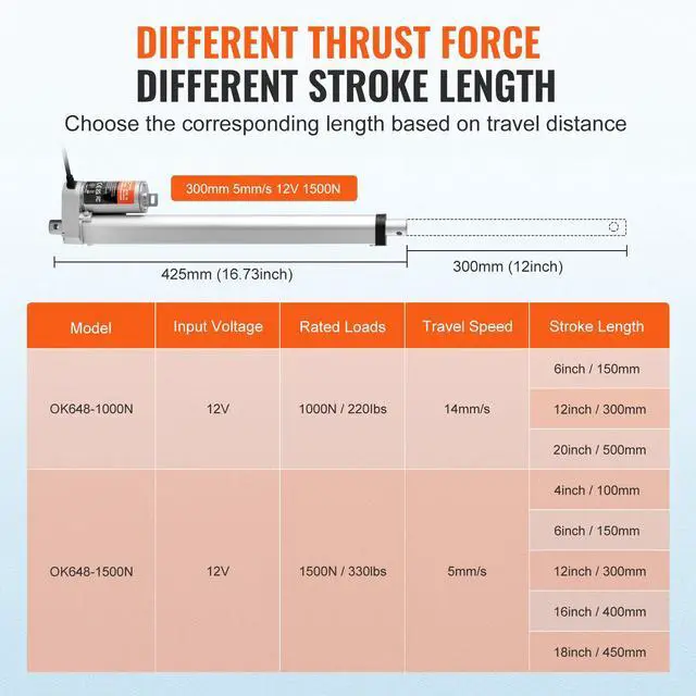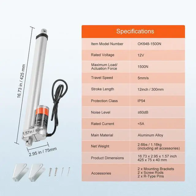 Protection Class: IP54,Noise Level: 60dB,Maximum Load/Actuation Force: 1500N,Item Model Number: OK648-1500N,Travel Speed: 0.19 inch/s / 5 mm/s,Stroke Length: 12 inch / 300 mm,Product Dimensions: 16.73 x 2.95 x 1.57 inch / 425 x 75 x 40 mm,Net Weight: 2.6 lbs / 1.18 kg (including all accessories),Main Material: Aluminum Alloy,Rated Voltage: DC12V
