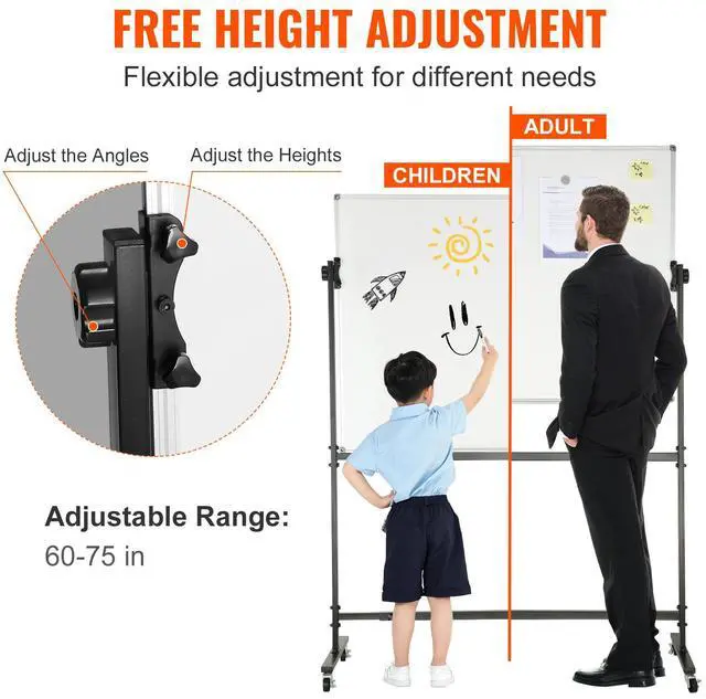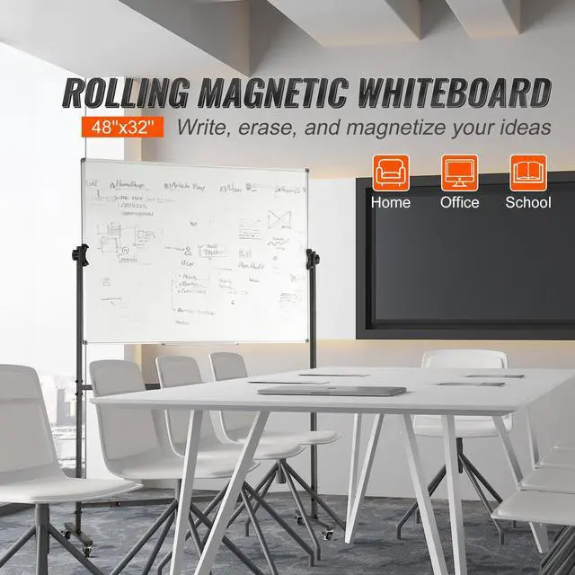 VEVOR Rolling Whiteboard, 48x32 inch Double-Sided Magnetic Mobile Whiteboard, 360° Reversible Adjustable Height Dry Erase Board with Wheels & Movable Tray for Office School