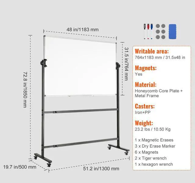 Casters: Iron+PP,Whiteboard Area: 800x1219x18mm/31.50x47.99x0.71 in,Material: Honeycomb Core Plate + Metal Frame,Magnets: Yes,Writable area: 764x1183mm/30.08x46.57 in,Weight: 23.15lbs/10.50 kg,Product Size: 1850x1300x500 mm/72.83x51.18x19.69 in