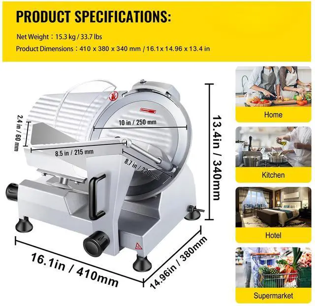 • VEVOR 240W Commercial Meat Slicer, Electric Deli Food Slicer, 10" Carbon Steel Blade Electric Food Slicer, 350-400RPM Meat Slicer, 0 - 0.47 inch Thickness Adjustable for Commercial and Home Use