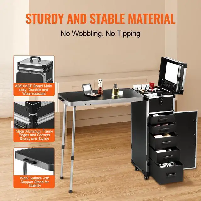 VEVOR Professional Makeup Train Case Aluminum Cosmetic Case, Workbench With Supporting Legs, Rolling Makeup Case Extra Large Trolley Makeup Travel Organizer, with 360° Swivel Wheels, Black