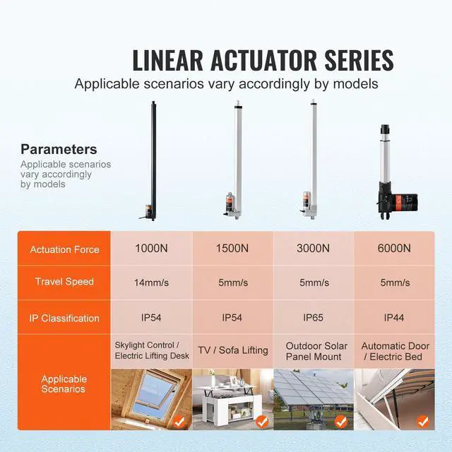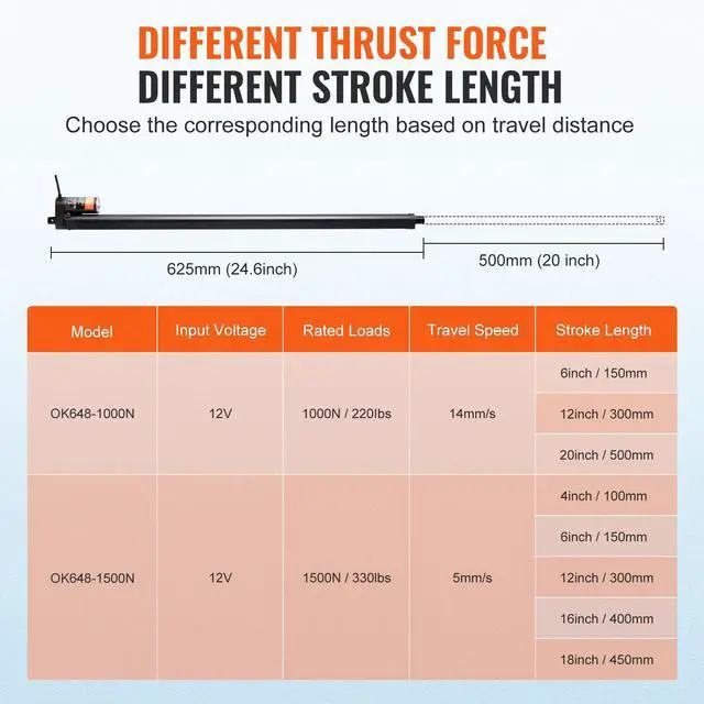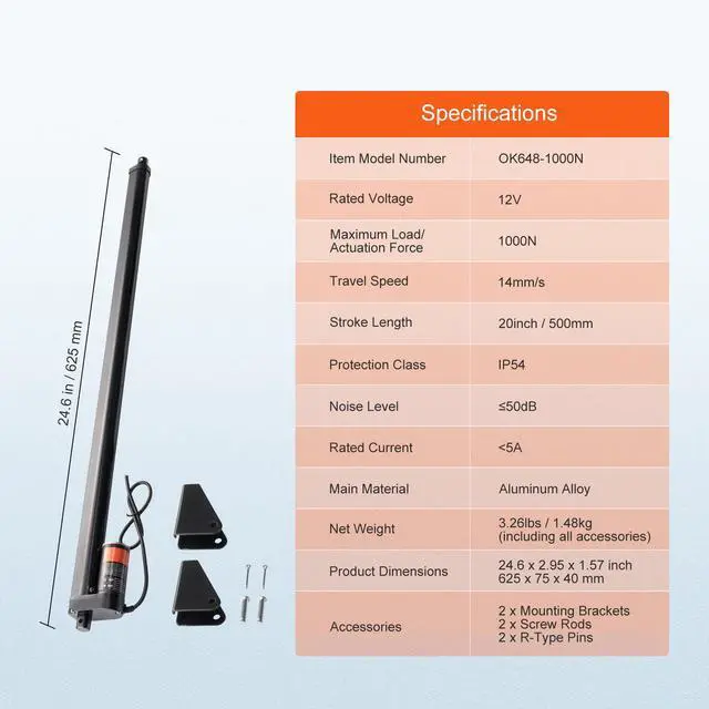 Protection Class: IP54,Noise Level: 50dB,Maximum Load/Actuation Force: 1000N,Item Model Number: OK648-1000N,Travel Speed: >0.55 inch/s / >14mm/s,Stroke Length: 20 inch / 500 mm,Product Dimensions: 24.6 x 2.95 x 1.57 inch / 625 x 75 x 40 mm,Net Weight: 3.26 lbs / 1.48 kg (including all accessories),Main Material: Aluminum Alloy,Rated Voltage: DC12V