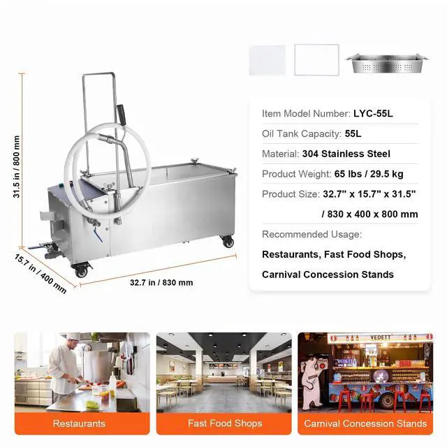 Item Model Number: LYC-55L,Product Weight: 65 lbs/29.5 kg,Oil Tank Capacity: 55L,Material: 304 Stainless Steel,Product Size: 32.7" x 15.7" x 31.5"/830 x 400 x 800 mm