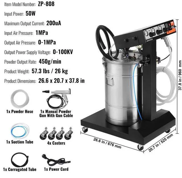Input Air Pressure: Max 1MPa,Input Power: 50W,Powder Output Rate: 450g/min,Item Model Number: ZP-808,Maximum Output Current: 200uA,Product Weight: 57.3 lbs / 26 kg,Product Dimensions: 26.6 x 20.7 x 37.8 inches / 676 x 525 x 960 mm,Output Air Pressure: 0-1MPa,Output Power Supply Voltage: 0-100KV