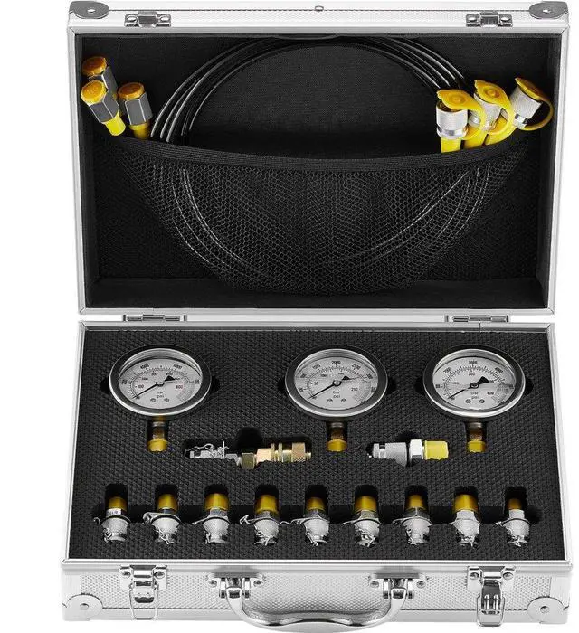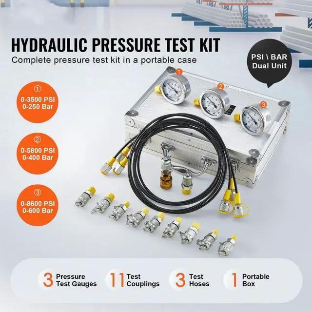 VEVOR Hydraulic Pressure Test Kit, 250/400/600bar, 3 Gauges 11 Test Couplings 3 Test Hoses, Excavator Hydraulic Test Gauge Set with Portable Carrying Case for Excavator Tractors Construction Machinery