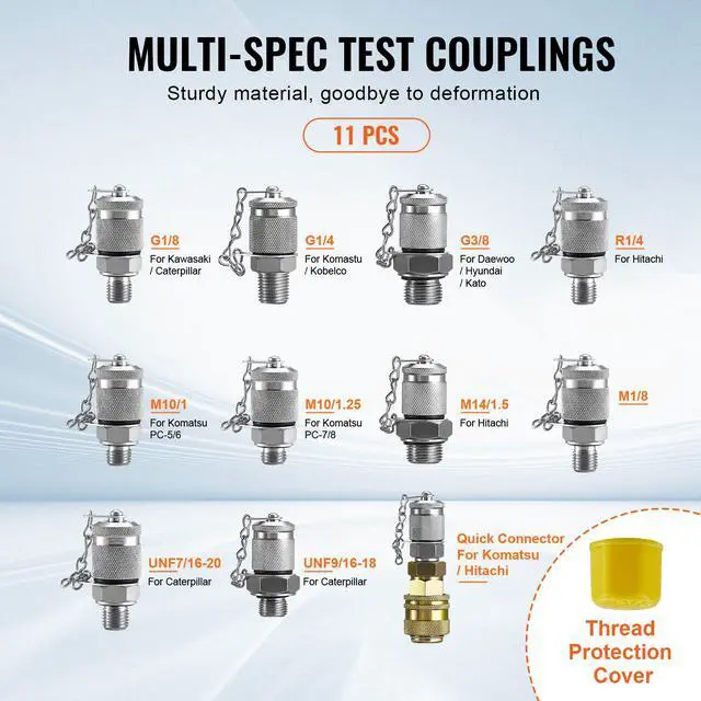Number of Test Gauge: 3,Couplings Spec.: G1/8, G1/4, G3/8, R1/4, M10/1, M10/1.25, M14/1.5, M1/8, UNF7/16-20, UNF9/16-18, Quick Connector,Pressure Range: 0-3500 PSI / 250 Bar; 0-5800 PSI / 400 Bar; 0-8600 PSI / 600 Bar,Hose Length: 5.2 ft/1.6 m,Item Model Number: TKS-1,Main Material: Aluminum Alloy 6061, 304 Stainless Steel
