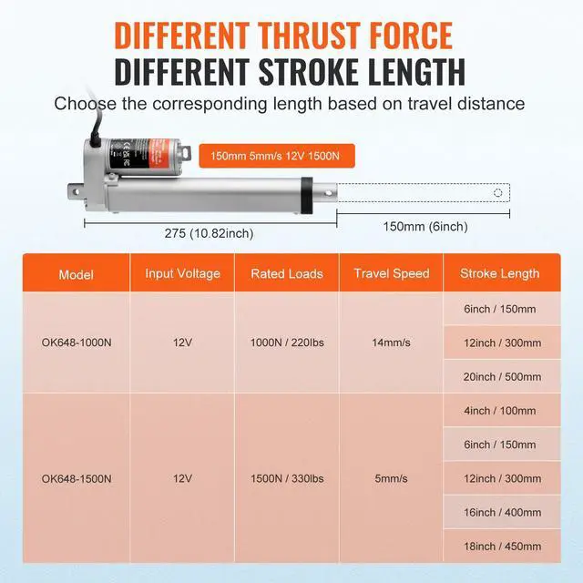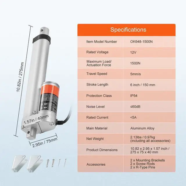 Protection Class: IP54,Noise Level: 60dB,Maximum Load/Actuation Force: 1500N,Item Model Number: OK648-1500N,Travel Speed: 0.19 inch/s / 5 mm/s,Stroke Length: 6 inch / 150 mm,Product Dimensions: 10.82 x 2.95 x 1.57 inch / 275 x 75 x 40 mm,Net Weight: 2.13 lbs / 0.97 kg (including all accessories),Main Material: Aluminum Alloy,Rated Voltage: DC12V