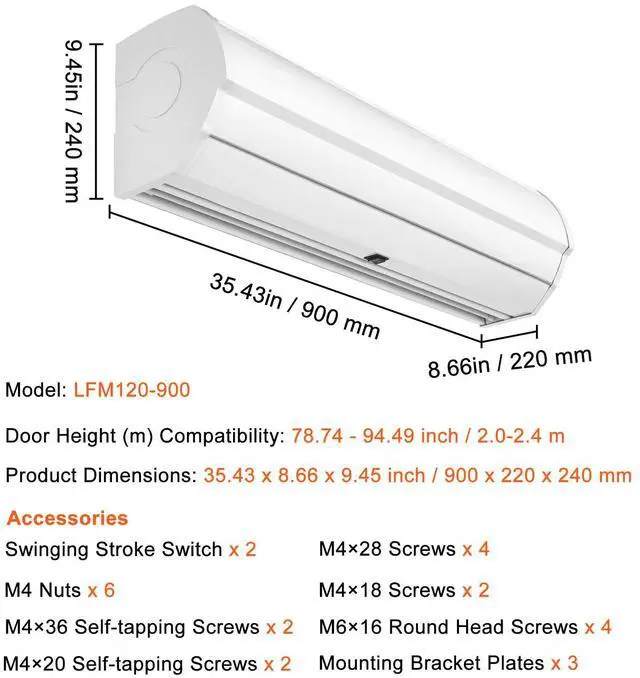Fit for Door Height: 78.74 - 94.49 inch / 2.0-2.4 m,Max Airflow(CFM/m³/h): 900/1528,Voltage: AC120V 60Hz,Model: LFM120-900-U,Product Dimensions: 35.43 x 8.66 x 9.45 inch / 900 x 220 x 240 mm,Colour: White