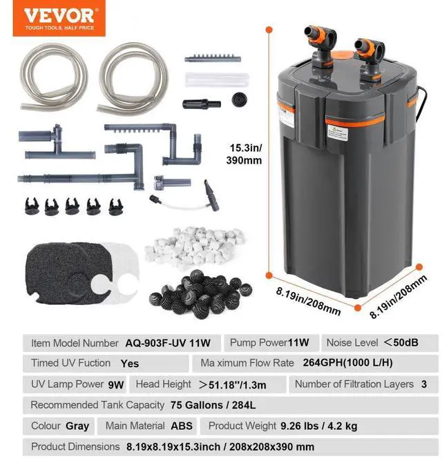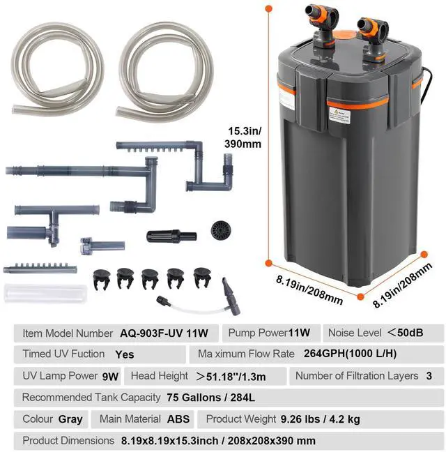 Efficient Filtration: The built-in pump has a maximum flow rate of 264GPH (1000 L/H) with a power of 11W, recommended for use in 75-gallon freshwater aquariums, turtle tanks, and fish tanks. The water flows through the media layers to filter water and ensure a clean aquatic condition. Each layer has a sponge to hold it in place, and it comes with ceramic rings and bio-balls.