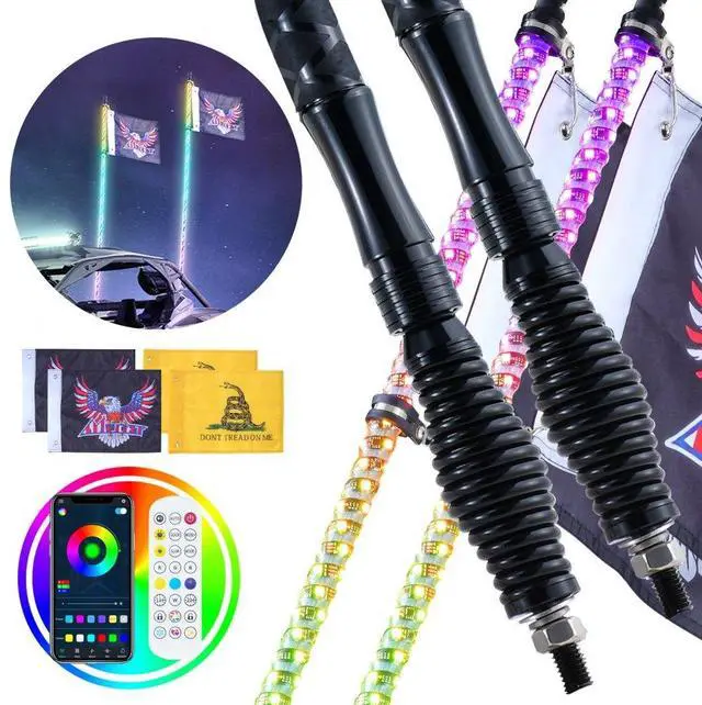 VEVOR 2 PCS 4 FT Whip Light with Spring Base, Led Whip Light with APP & Remote Control, Waterproof 360° Spiral RGB Chasing Lighted Whips with 2 Flags, for UTVs, ATVs, Motorcycles, RZR, Can-am, Go-kart
