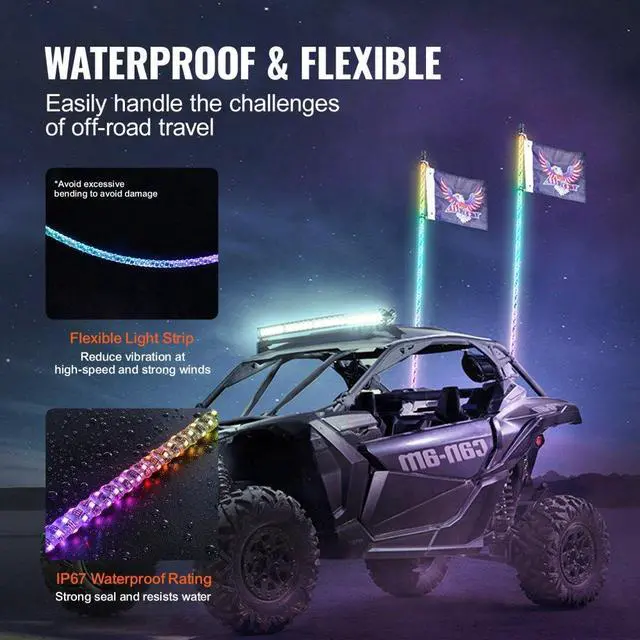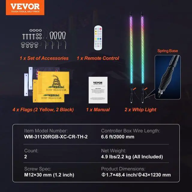 Waterproof Rate: IP67,Controller Box Wire Length: 6.6 ft/2000 mm,Screw Spec.: M12×30 mm (1.2 inch,Item Mode Number: WM-31120RGB-XC-CR-TH-2,Control Method: Remote Control & App,Material: PC+Aluminum 6061+Lamp Strip+EVA Film,Product Dimensions: 1.7×48.4 inch/43×1230 mm,Base Type: Normal Base+Spring Base, 0.7"/18 mm Connector,Type: 360° Spiral, 300 Colors, 370 Modes, 32 Brightness,Base Size: 1.2×2.8 inch/31×70 mm (Normal), 1.7×6.2 inch/42.5×158.5 mm (Spring),Voltage: DC12-24V,Whip Light: 2 PCS, 4 FT,Current: 0-3A,Net Weight: 4.9 lbs/2.2 kg (All Included)